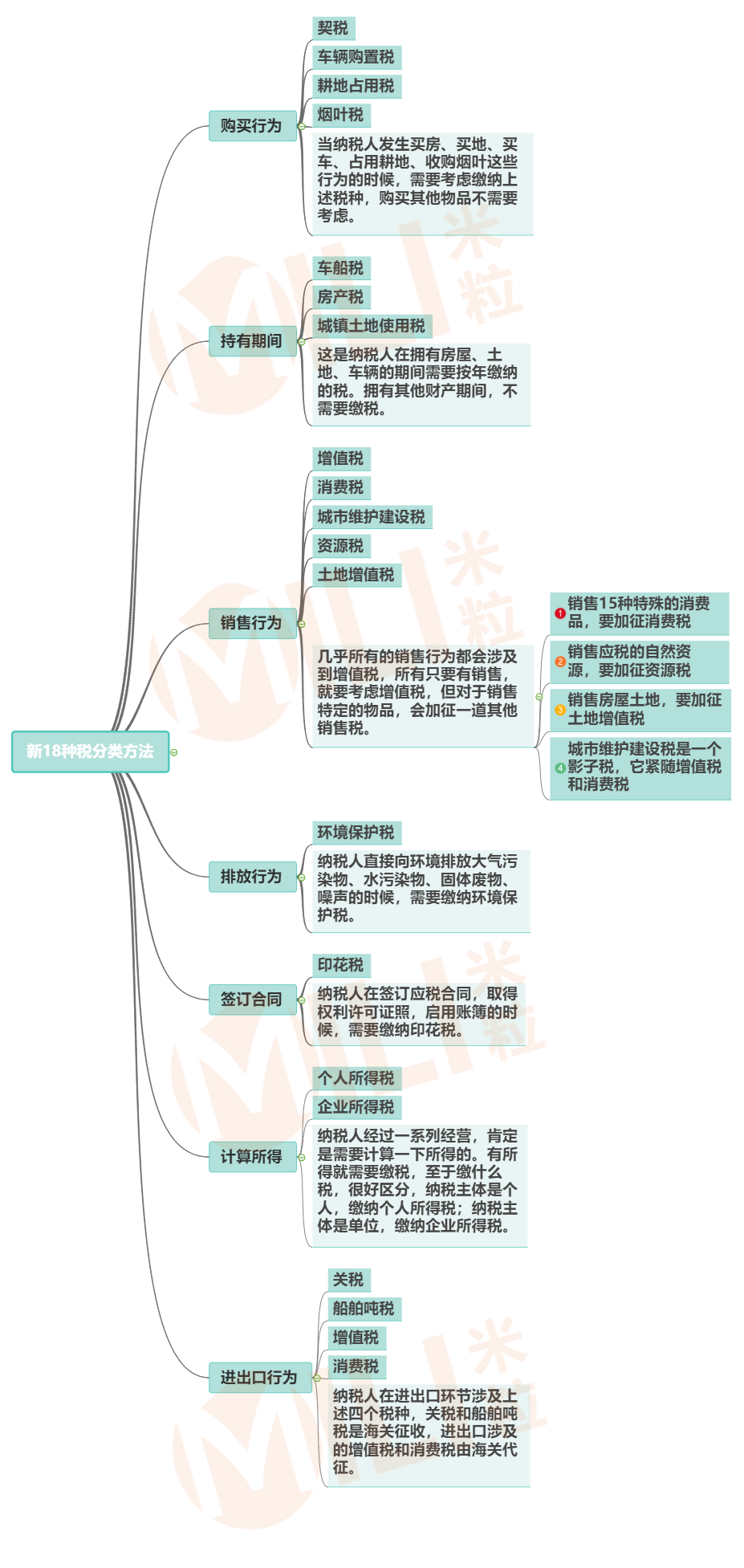 对于上述18个税种,实际工作中有很多税种分类方法,为了方便大家记忆,也给大家做了一张思维导图: