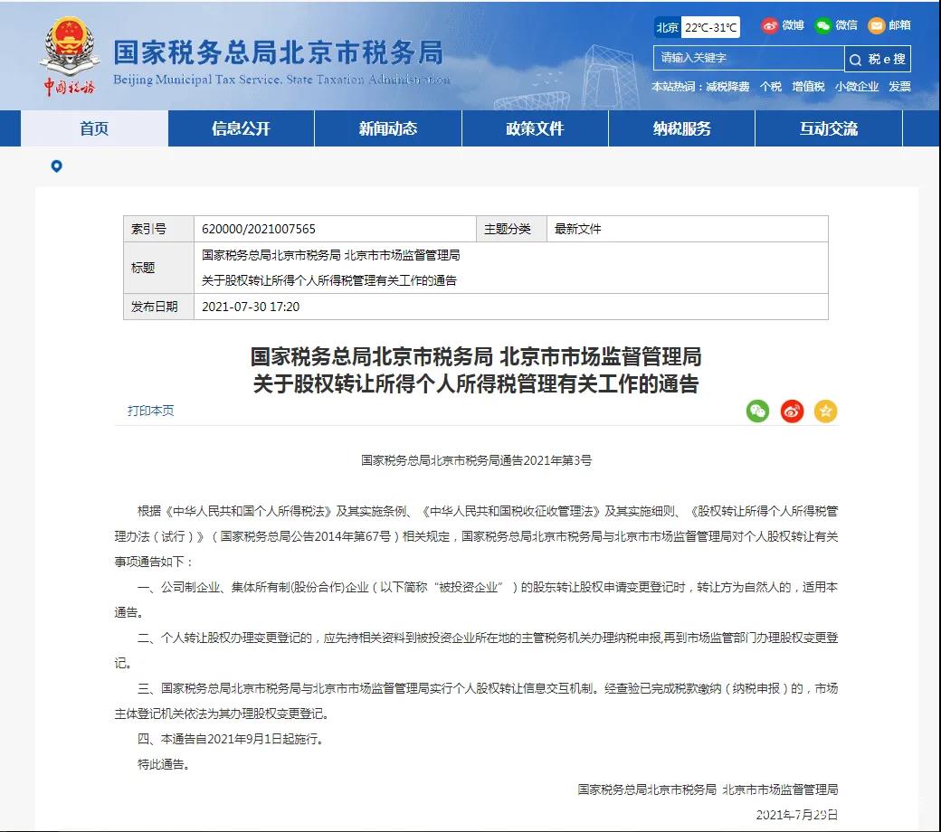 7月30日,国家税务总局北京市税务局、北京市市场监督管理局发布2021年第3号文《关于股权转让所得个人所得税管理有关工作的通告 》,明确要求个人股东转让股权,需要先完成税款缴纳(纳税申报),市场监督管理局才能为其办理股权变更登记。本通告自2021年9月1日起施行。