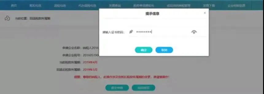 确认无误后点击“提交申请”按钮,系统会要求用户再次输入证书密码验证用户身份,用户点击“确认”按钮提交。