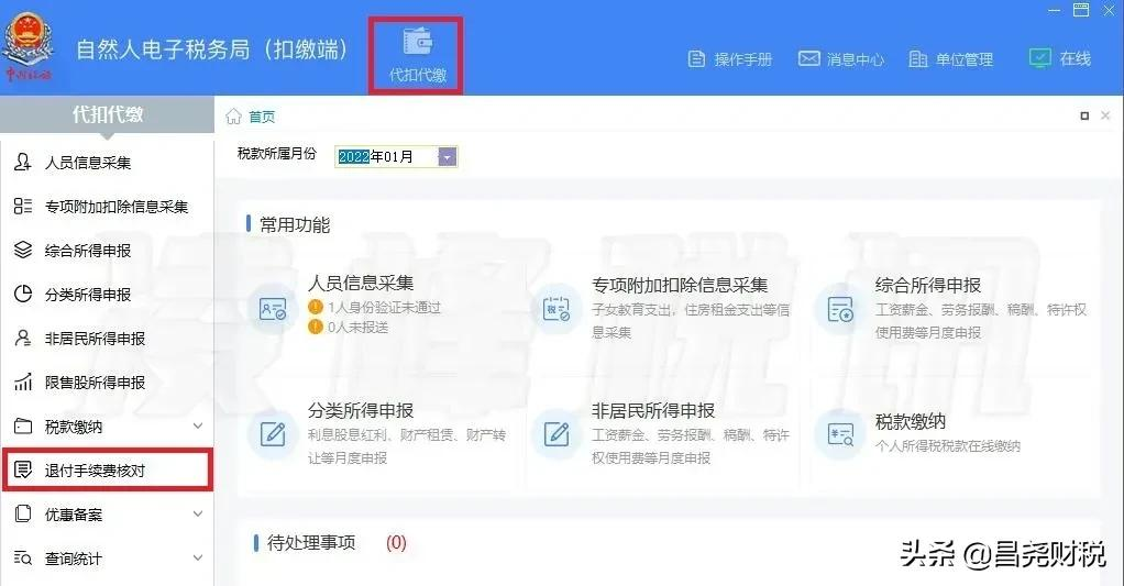 1、登录扣缴端后,在“代扣代缴”界面,点击左侧菜单“退付手续费核对”。
