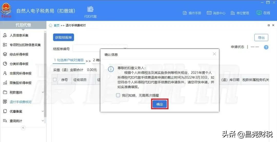 2、进入“退付手续费核对”界面,系统自动弹出“确认信息”提示框,点击【确定】,系统自动带出单户核对清册。
