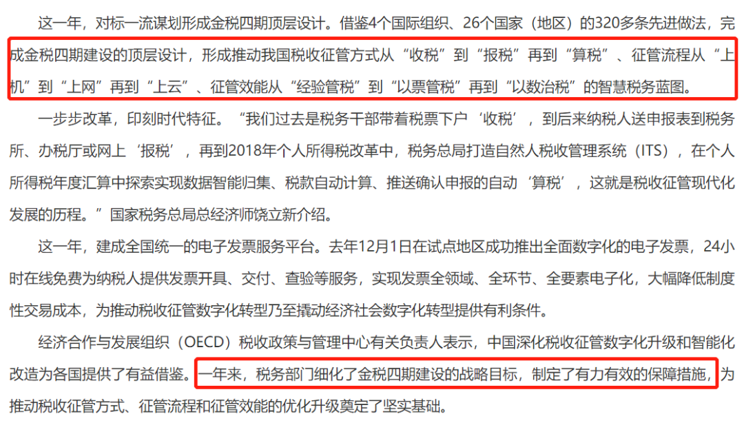 据悉,金税四期建设的顶层设计已完成,形成了征管方式从“收税”到“报税”再到“算税”、征管流程从“上机”到“上网”再到“上云”、征管效能从“经验管税”到“以票管税”再到“以数治税”的智慧税务蓝图!