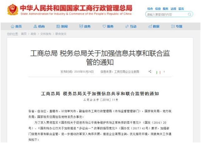 工商总局 税务总局关于加强信息共享和联合监管的通知